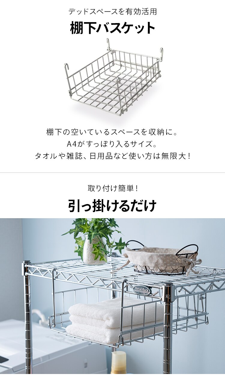 メタルラックの棚下のデットスペースをなくすことができる棚下バスケットです。雑誌等(A4ファイルサイズ)にぴったりのサイズです。前フック、後フックと取り付け金具が付いています後の取り付け金具は自由に動くので、どんなメタルラックにも合います。(棚奥行き27.5cm以上対応)