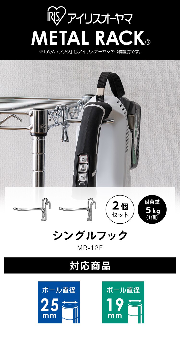 - 【2個セット】 メタルラック フック シングル MR-12F (ポール直径25mm・19mm)