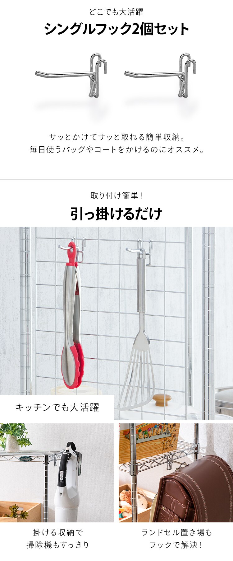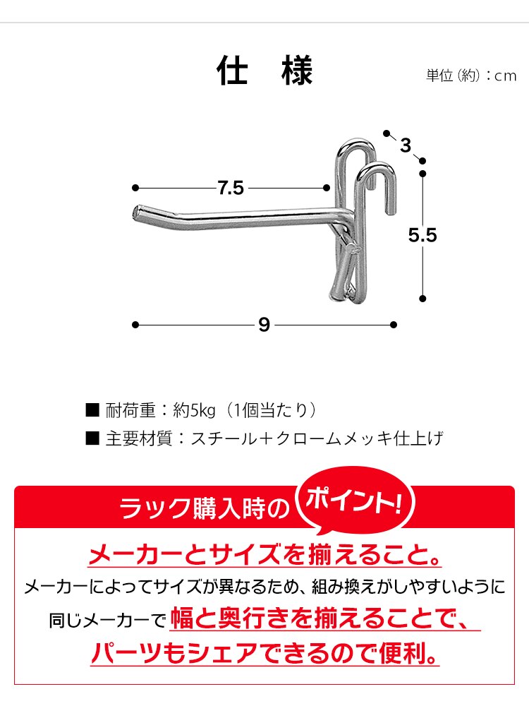 - メタルラックに子供用のリュックや上着を取り付けるために購入。100均にも似たようなのがあったりS字フックもありますが、こちらはしっかりと固定出来るので購入して良かったです。とても好かったので追加購入も検討。メタルラックのパーツはとてもいいですね。