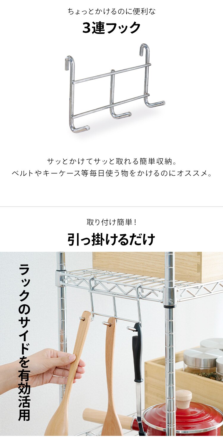 メタルラック、メタルミニ共通の別売3連フックです。棚板やメッシュパネルに取り付けられます。