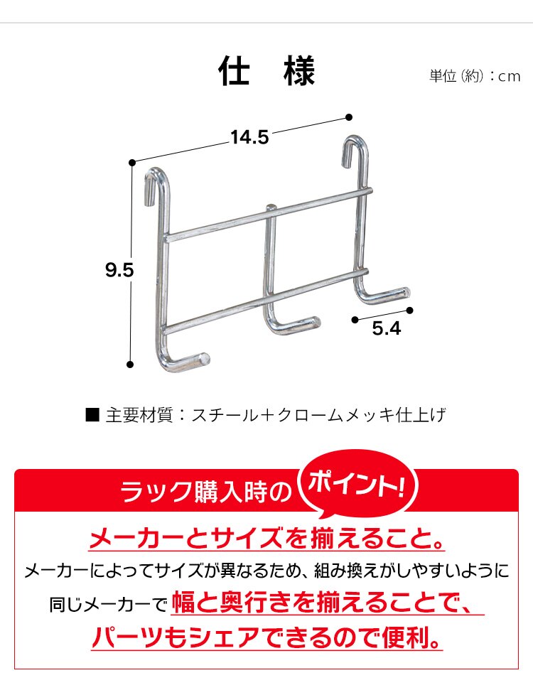 - 引越してメタルラックの使い方を少し変えたのでこちらを購入。19ミリのメタルラックなので少しフックが太く感じますが特に問題はないので快適に使ってます。メタルラックの部品だけでも購入して使いやすく変更していけるのがありがたいです!
