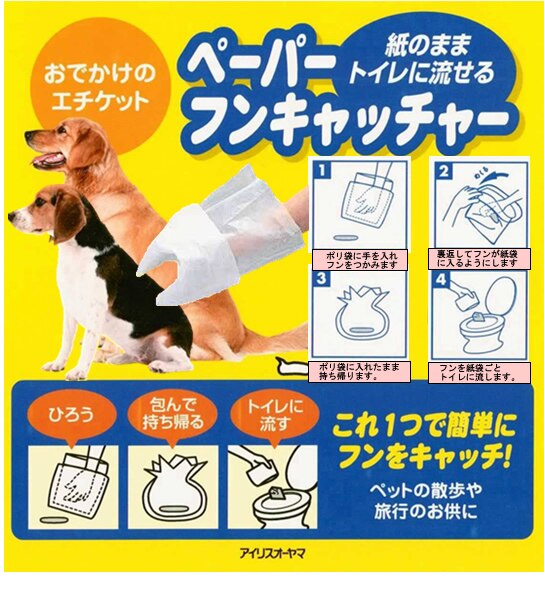 ティッシュの部分(紙袋の部分)は水溶性なので、フンをいれたままトイレに流すことができ、後片付けが簡単です。
