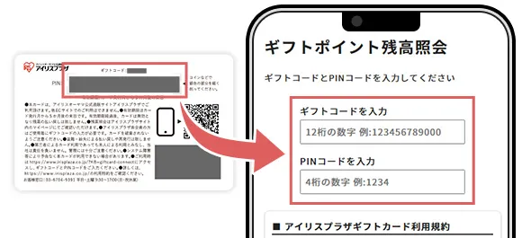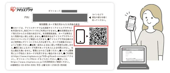 利用者は、QRコードの読み取りその他の方法によりアイリスプラザギフトカード記載のURLへアクセスし、ギフトコードを入力することでギフトポイントを獲得し、商品購入等で使用することができます。