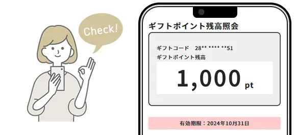 - ギフトポイント残高は、本サイト内の残高照会サイトで確認することができます。